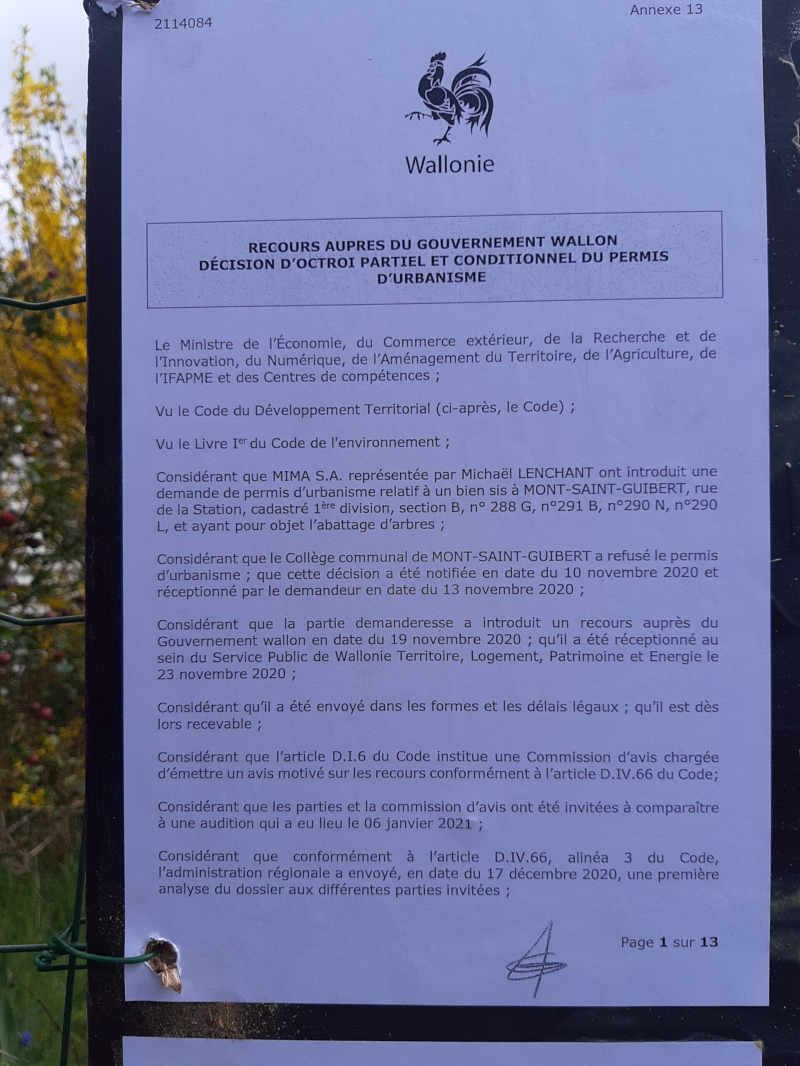 Malgré un refus de permis de la Commune de Mont-Saint-Guibert, le propriétaire introduit un recours auprès de la Région Wallonne, qui accorde, un abattage "partiel" ... laissant seules quelques malheureux chênes parmi les copeaux.